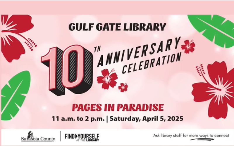 SARASOTA COUNTY – Sarasota County Libraries and Historical Resources invite the community to celebrate the 10th anniversary of Gulf Gate Library’s new facility on Saturday, April 5, from 11 a.m. to 2 p.m., at 7112 Curtiss Ave., Sarasota.